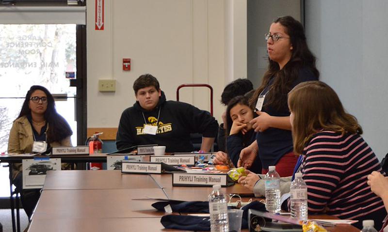 In the photo: María Gil (standing) of Ithaca High School speaks at OCM BOCES in East Syracuse on January 15 during the first training session for the Puerto Rican/Hispanic Youth Leadership Institute. Gil and 21 other student delegates from Central New York will participate in four more sessions at BOCES before visiting the Onondaga County Legislature in March. The program culminates with a three-day visit to the New York State Assembly from March 19-21 in Albany. The purpose is to empower Hispanic/Latino students in the areas of citizenship, leadership, team building, debate, parliamentary procedures and the New York State legislative process. Surrounding Gil, from left to right, are Ariadna Lopez of Corcoran High School in Syracuse; Ilan Mizrachi, Anthony Henriquez (partially visible), Yashaly Acosta-Vazquez, and Gabrielle Dufett, all of Ithaca High School.