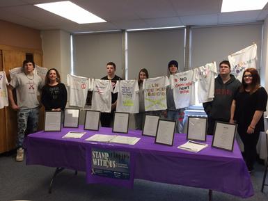 Pictured above: STARS senior Shaun Gebo, freshman Matt Graham, senior Ashley Neupert, sophomore Mark Timson, senior Devon Hale, and junior Courtney Radley stand with Evoqua’s Trish Angrick behind one of the informational tables the students created, decked out in purple and white, to help Vera House kick-off their annual White Ribbon Campaign.