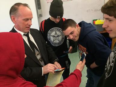 Pictured above: STARS seniors Devon Delia, Jake Cortini, Zack Bambrick, and Randy LaTray consult with Dave Beckwith, owner of All Custom Log Cabins, to brainstorm strategies to create concepts geared towards their target audience.