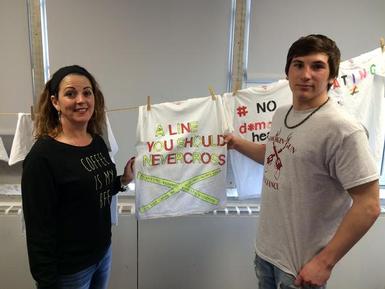 STARS juniors turned their anti-violence messages and drawings into T-shirts that were strung on a clothesline. The Senior ELA class contributed a film that they produced and edited based on their research of data regarding relationship abuse centered on teens and young adults. Math students in Brenda Lofthouse’s class created polls and represented their findings in large, colorful graphs. English students in Rocco Rachetta’s classes hand-wrote powerful acrostic poem displays. History classes focused on changing social views by creating a music video and T-shirts. One student offered a live performance of a song he composed himself. In art classes, Michelle Ekross’ students used a variety of mediums to create impressive visuals such as a life-sized wall of facts. Finally, forensics students studied the effects of violence, and culture and gym classes discussed character education.