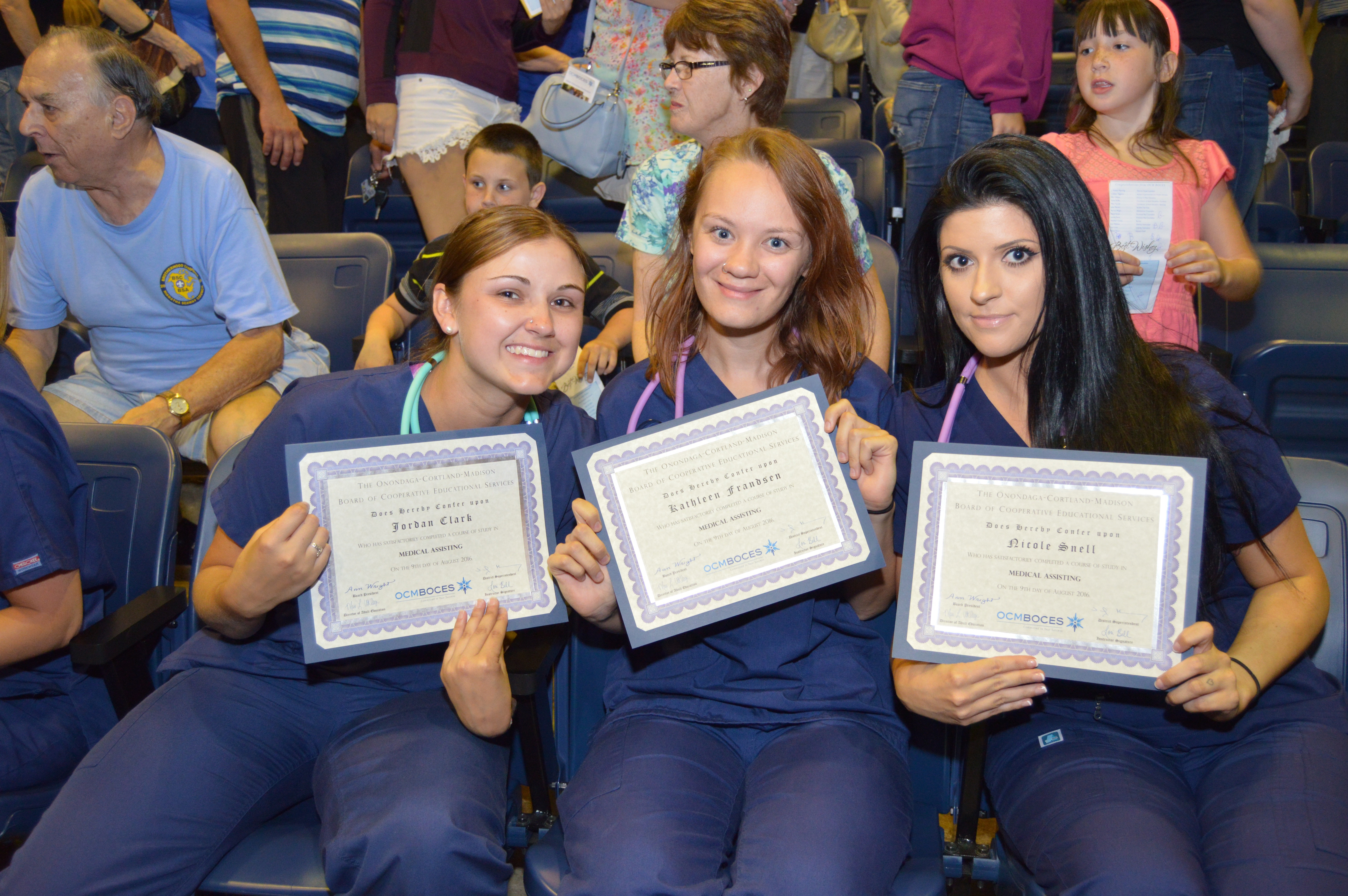 Pictured above (left to right) are Jordan Clark, Kathleen Frandsen and Nicole Snell, three 2016 medical assisting program graduates from the OCM BOCES McEvoy Campus. The McEvoy ceremony was held the night before, on August 9. Just over 40 students graduated from OCM BOCES Cortland programs.