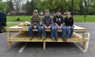 - Construction students in Jim Bender’s classes at our Cortlandville Campus recently built four wooden theater stages, a ramp and a set of stairs for the Cortland Youth Bureau so they can be used for concerts and other events this summer in Courthouse Park. In the photo, from left to right, are seniors Zach Williams-Bachman from Homer, Logan Bedford from Tully, Charles Batsford from Cortland, and Holly Vallese from Cortland. All four worked on the project.